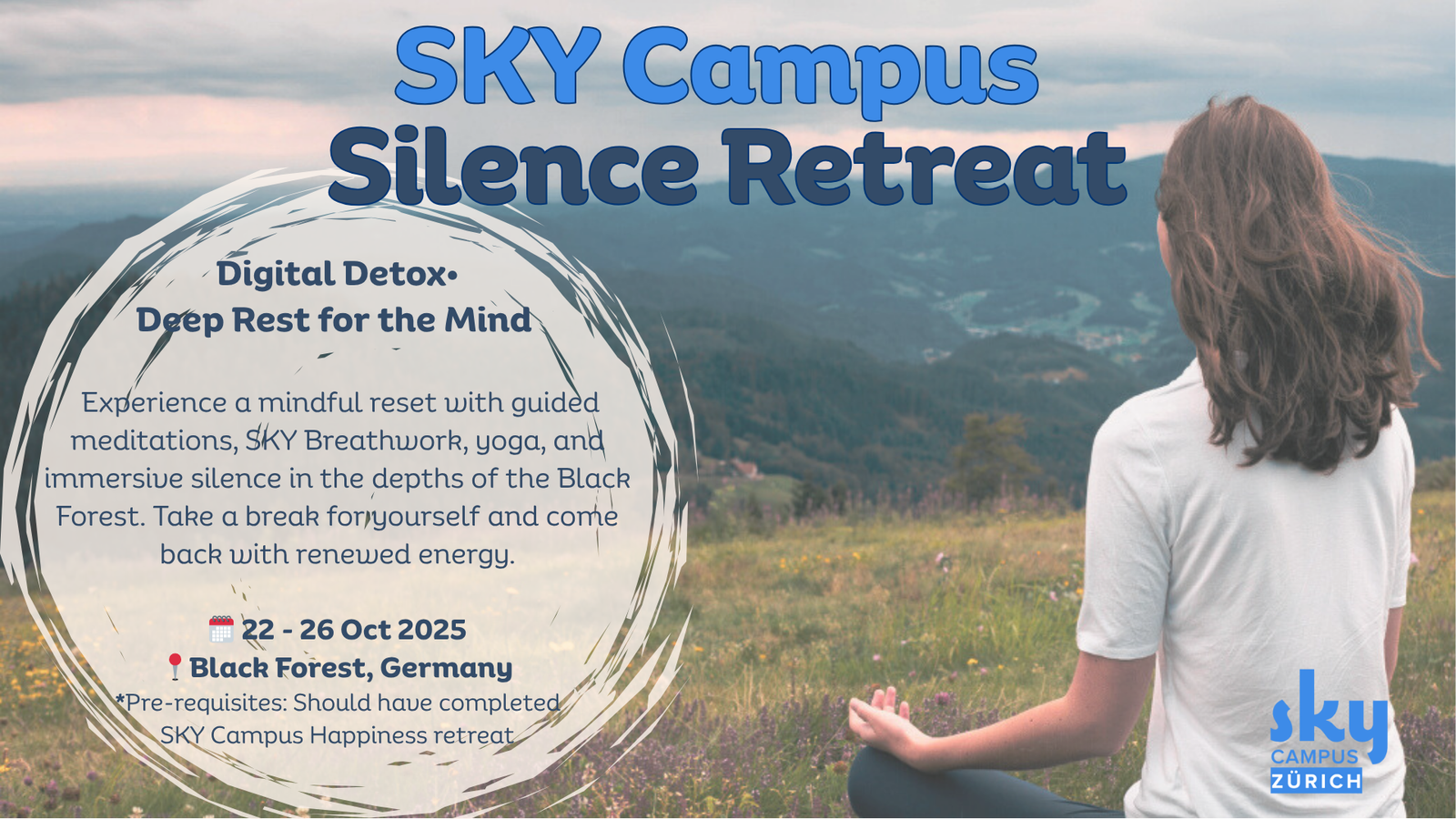 This residential retreat is designed exclusively for university students from across Europe who are ready to take their SKY Campus Happiness Retreat experience to the next level and explore the profound stillness and clarity that silence can bring. Watch a short preview of what to expect from this retreat! ->